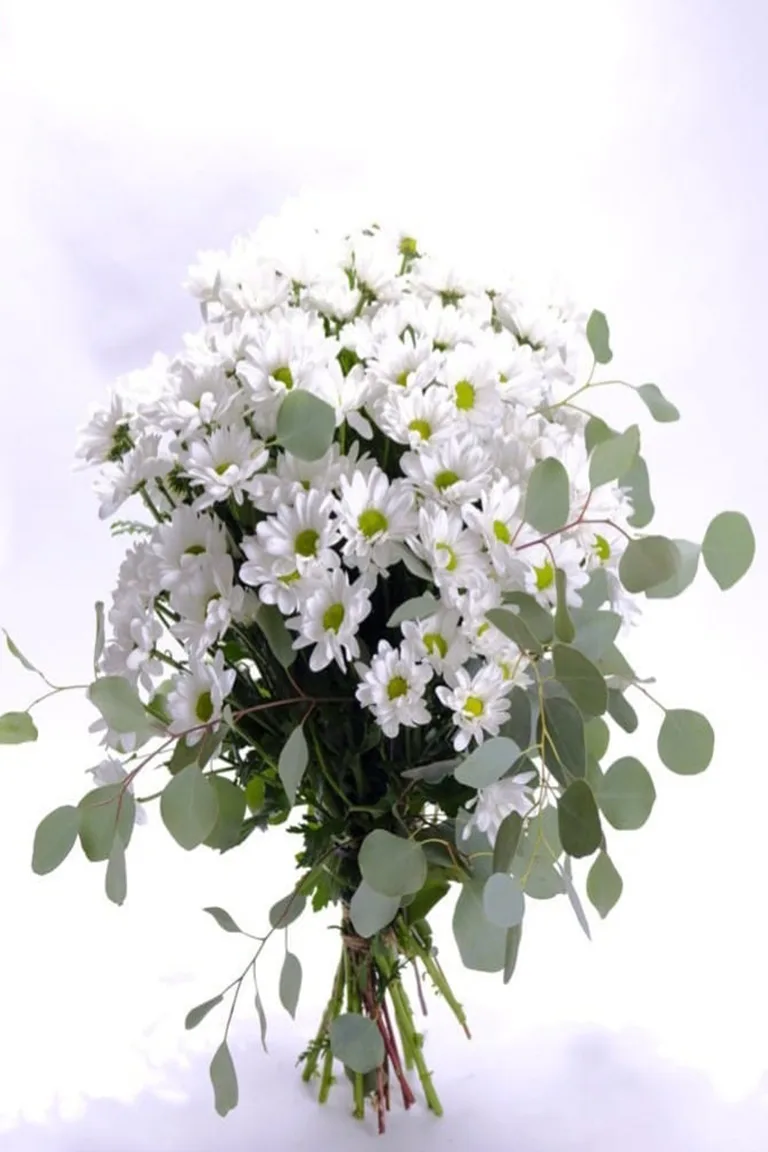 Una composición sencilla y luminosa que combina la blancura de las margaritas con el tono verde azulado del eucalipto. Aporta frescura y elegancia a cualquier estancia.