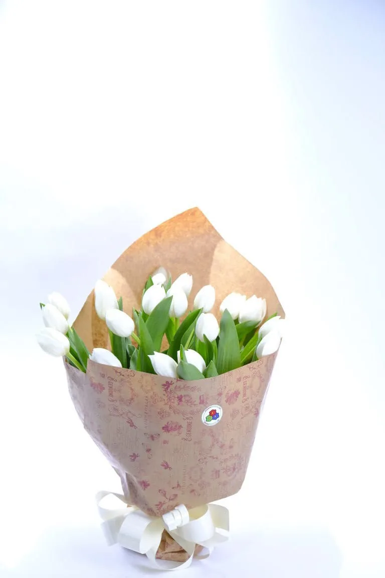 Símbolo de paz y pureza, este ramo está envuelto en papel artesanal marrón con un lazo blanco. Es la elección perfecta para transmitir sentimientos cálidos.